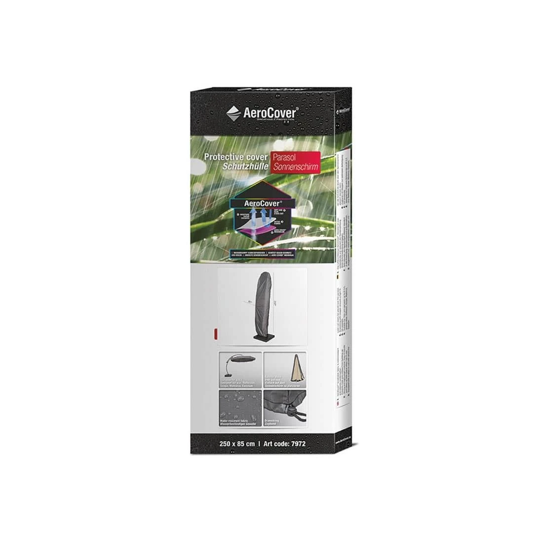 Schützen Sie Ihren Ampelschirm mit der AeroCover® Schirmhülle vor jeglichen Wettereinflüssen. Die AeroCover® Schutzhülle besteht aus einem leichten Ripstop-Polyester mit integrierter, atmungsaktiver Membran. Zudem ist das Material äußerst wasserabweisend (Gewebe 100% wasserdicht, Nähte spritzwasserfest). Der Clou: Dank dieser Eigenschaften beugt die Schutzhülle Schimmel und Stockflecken vor, denn sie reduziert durch ihre Atmungsaktivität die Kondenswasserbildung.