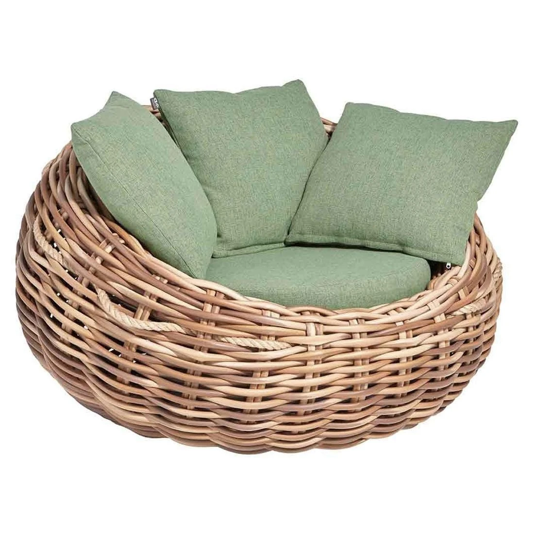 Eine dicke, bequeme Auflage und drei Kuschelkissen sorgen für den nötigen Komfort. Alle Polsterbezüge sind abnehmbar und bis zu 30°C in der Waschmaschine waschbar. Regen perlt vom Bezug der Polster ab und auch das robuste Polyrattan-Rundgeflecht (20 mm) ist gegenüber Feuchtigkeit und UV-Strahlung beständig. Sisalseile, die in das Geflecht eingewoben sind, unterstreichen nicht nur den natürlichen Charakter des Möbels, sondern sind gleichzeitig praktische Griffe, mit denen Sie den Loungesessel auf der Terrasse und im Garten bewegen können.