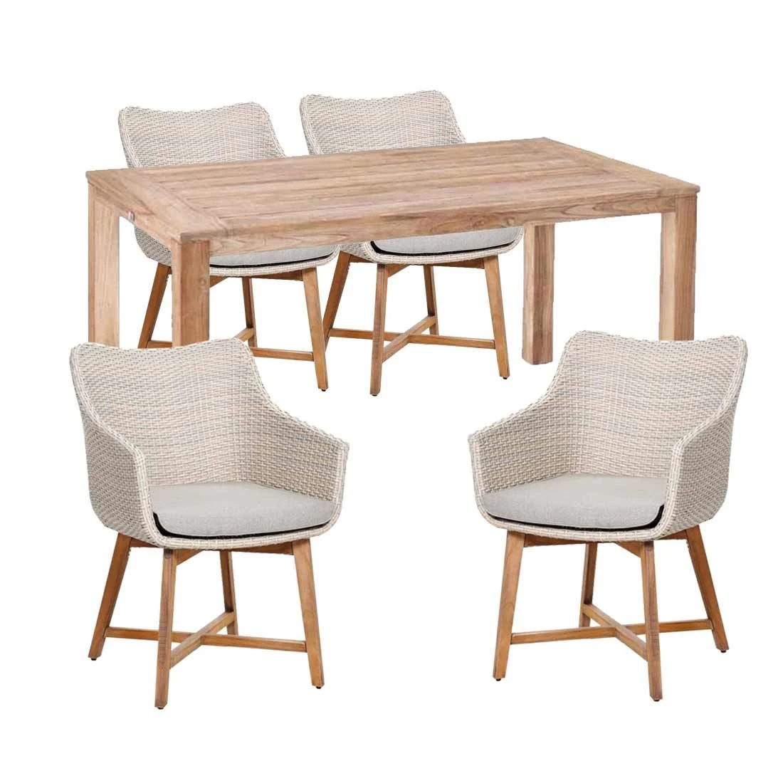 Das stabile Untergestell ist von einem hochwertigen Geflecht aus Polyrattan umwoben. Sowohl die Gestelle als auch die Tischplatte werden aus Teakholz gefertigt. Somit gibt das Gartenmöbel-Set ein einheitliches Bild auf Ihrer Terrasse ab.