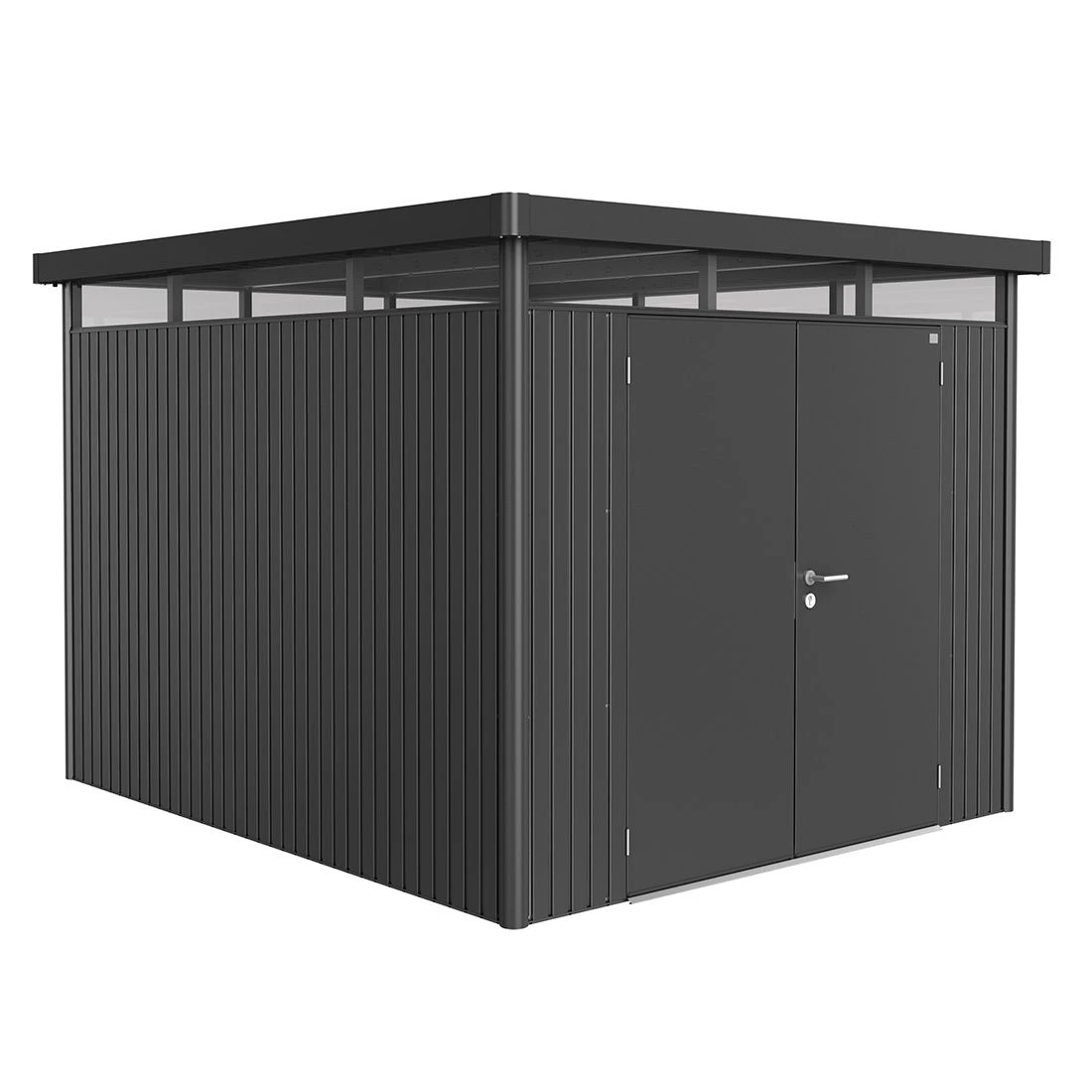 Edles Industriedesign in beeindruckender Form: Mit dem modernen Flachdach und dem integrierten Rundum-Oberlicht setzt das 275x315x222 cm (BxTxH) große Biohort HighLine Gerätehaus H5 in Dunkelgrau-Metallic starke Akzente. Dabei richtet sich die Produktreihe HighLine von Biohort an Personen, die sich ein stilvolles, sicher abschließbares Gerätehaus in höchster Qualität und mit vielen durchdachten Funktionalitäten gönnen möchten. Im Gegensatz zu günstigeren Produkten verfügt das Biohort Gerätehaus über eine doppelte Stahl-Blechstärke. Zudem wartet es mit einem umlaufenden Acrylglas-Oberlicht unter dem Flachdach auf.