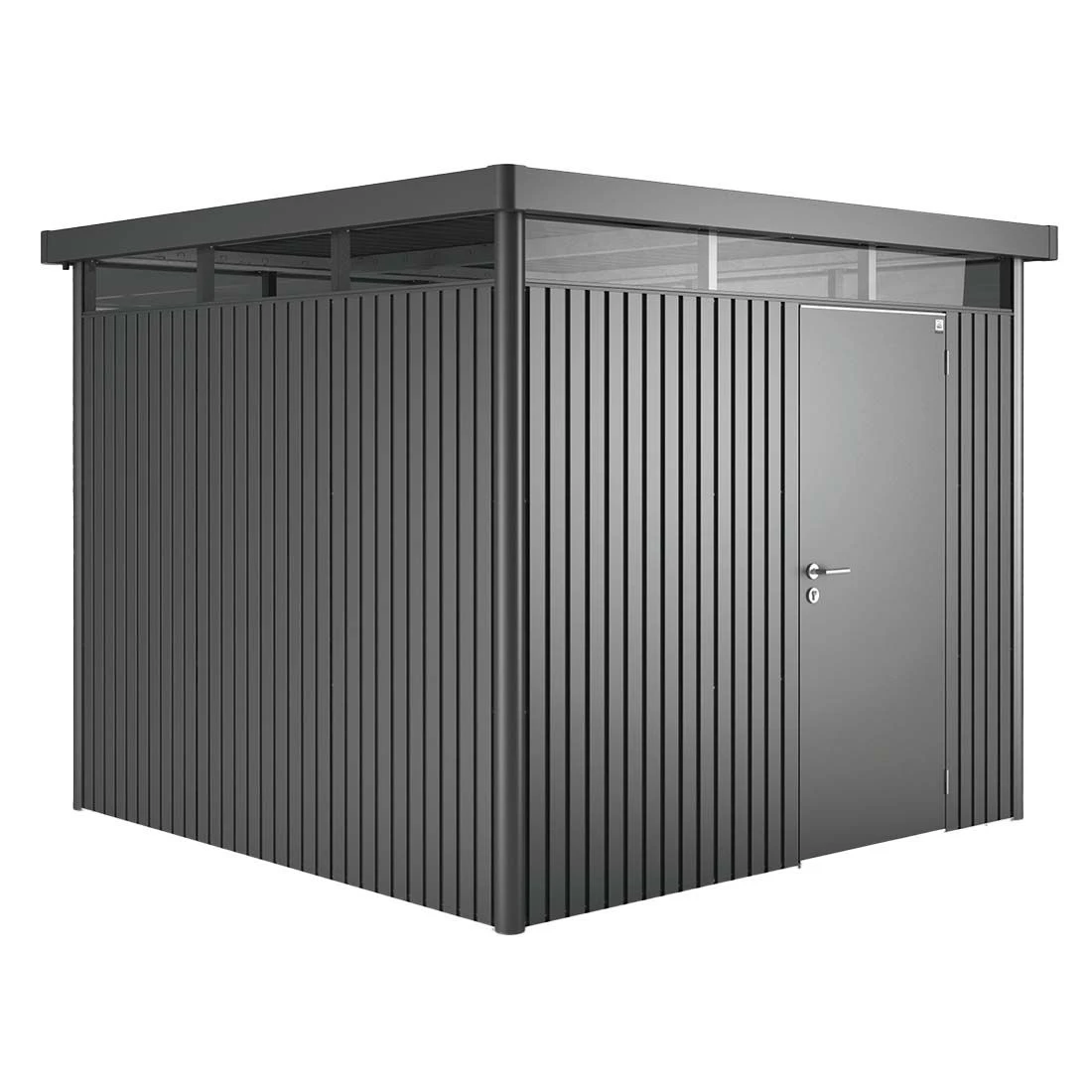 Edles Industriedesign in beeindruckender Form: Mit dem modernen Flachdach und dem integrierten Rundum-Oberlicht setzt das 275x275x222 cm (BxTxH) große Biohort HighLine Gerätehaus H4 in Dunkelgrau-Metallic starke Akzente. Dabei richtet sich die Produktreihe HighLine von Biohort an Personen, die sich ein stilvolles, sicher abschließbares Gerätehaus in höchster Qualität und mit vielen durchdachten Funktionalitäten gönnen möchten. Im Gegensatz zu günstigeren Produkten verfügt das Biohort Gerätehaus über eine doppelte Stahl-Blechstärke. Zudem wartet es mit einem umlaufenden Acrylglas-Oberlicht unter dem Flachdach auf.