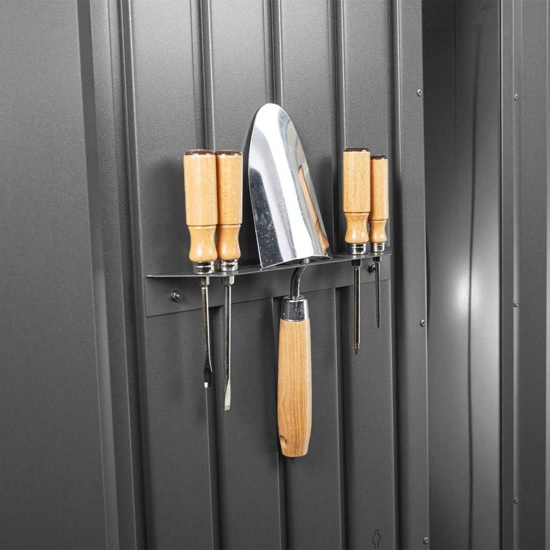 Der Biohort Werkzeughalter in Dunkelgrau-Metallic lĂ€sst sich an der Innenseite der TĂŒr montieren. Er besteht aus zwei Haltern fĂŒr kleinere Utensilien wie Gartenschaufel, Schraubenzieher und Ăhnliches.