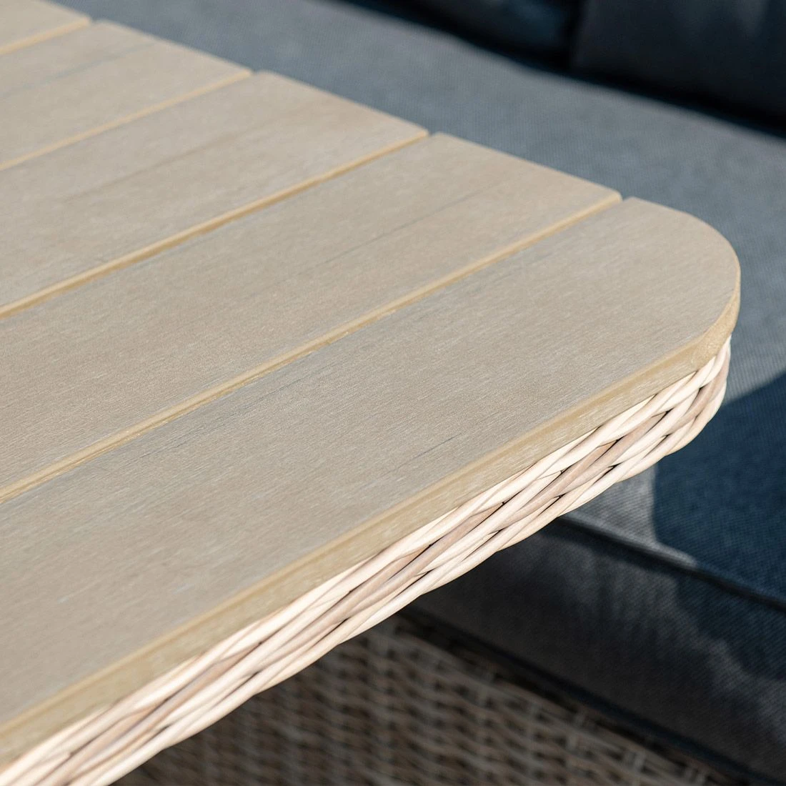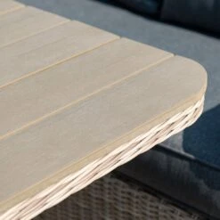 Damit die Dininglounge optisch ansprechend ist, sind der Korpus und die SitzflĂ€che im Farbton Vintage Willow gehalten. Das Gestell ist aus Aluminium hergestellt. Das Gestell, das mit hochwertigem Polyrattan umflochten ist, bringt ein exklusives Ambiente auf Ihre Terrasse. Dieses Material zeichnet sich durch eine hohe WetterbestĂ€ndigkeit aus. Als Bezug fĂŒr die Sitz- und RĂŒckenkissen wird der Outdoorstoff Spun Polyester verwendet. Dieses Material ist besonders wetterfest. Die hohe UV-BestĂ€ndigkeit lĂ€sst die Farben zudem lange strahlen. Die Farbe des Bezugs ist Reflex Black. Als Material fĂŒr die Tischplatte wird hochwertiger und leicht zu reinigender Kunststoff in Holzoptik verwendet. Farblich ĂŒberzeugt die Tischplatte in Kubu.