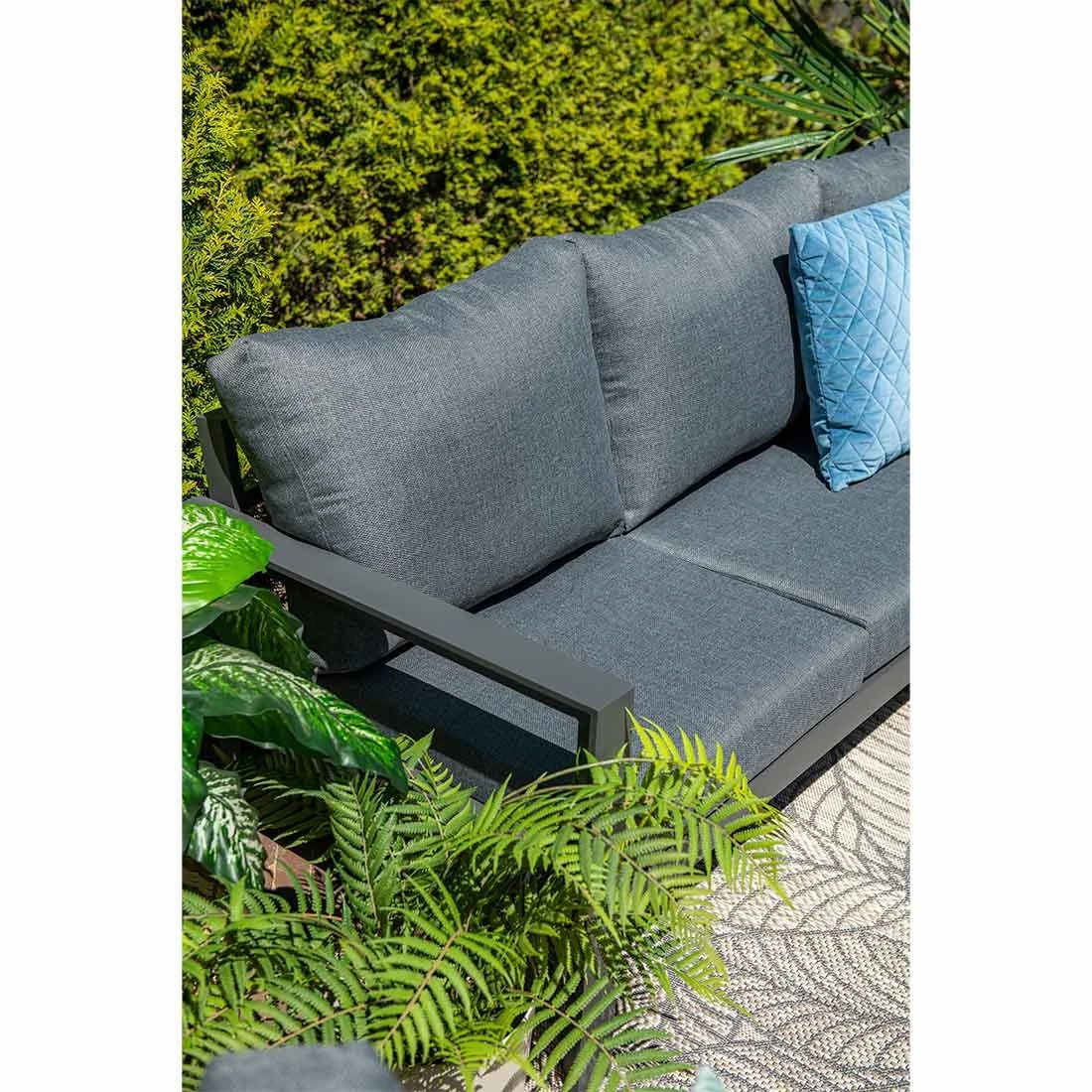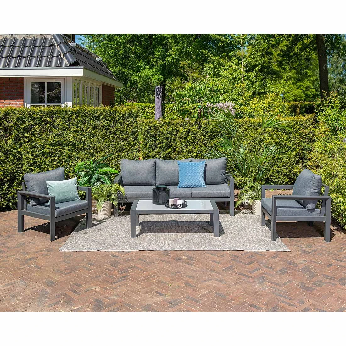 Als Gestellmaterial hat der Hersteller hochwertiges Aluminium gewählt. Optisch begeistert das Gestell in der Farbe Carbon Black. Der Bezug des Loungesets ist aus Polyester gefertigt. Für eine längere Haltbarkeit empfehlen wir bei stärkerem oder lang anhaltendem Regen, die abnehmbaren Kissen im Innenraum zu lagern. Die Tischplatte wird aus robustem Glas gefertigt. Farblich überzeugt die Tischplatte in Glas.