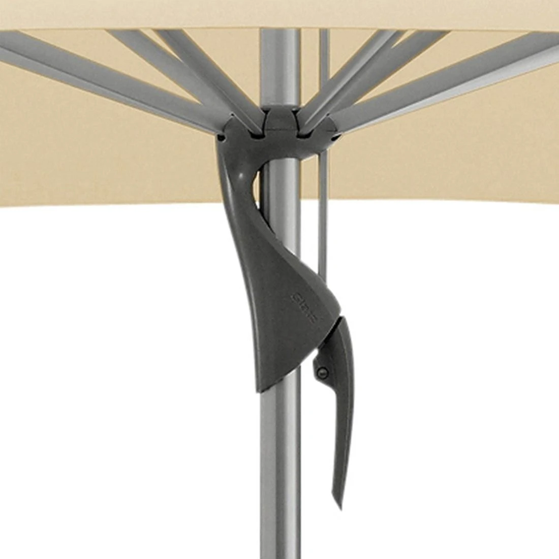 Bedienung: Einfach den Spannhebel nach unten ziehen und im Schieber einhängen. Durch das gegenläufige Servo-Prinzip gelingt dies mit minimalem Kraftaufwand. Eine Neigung des Schirmdaches ist bei diesem Modell nicht möglich.
