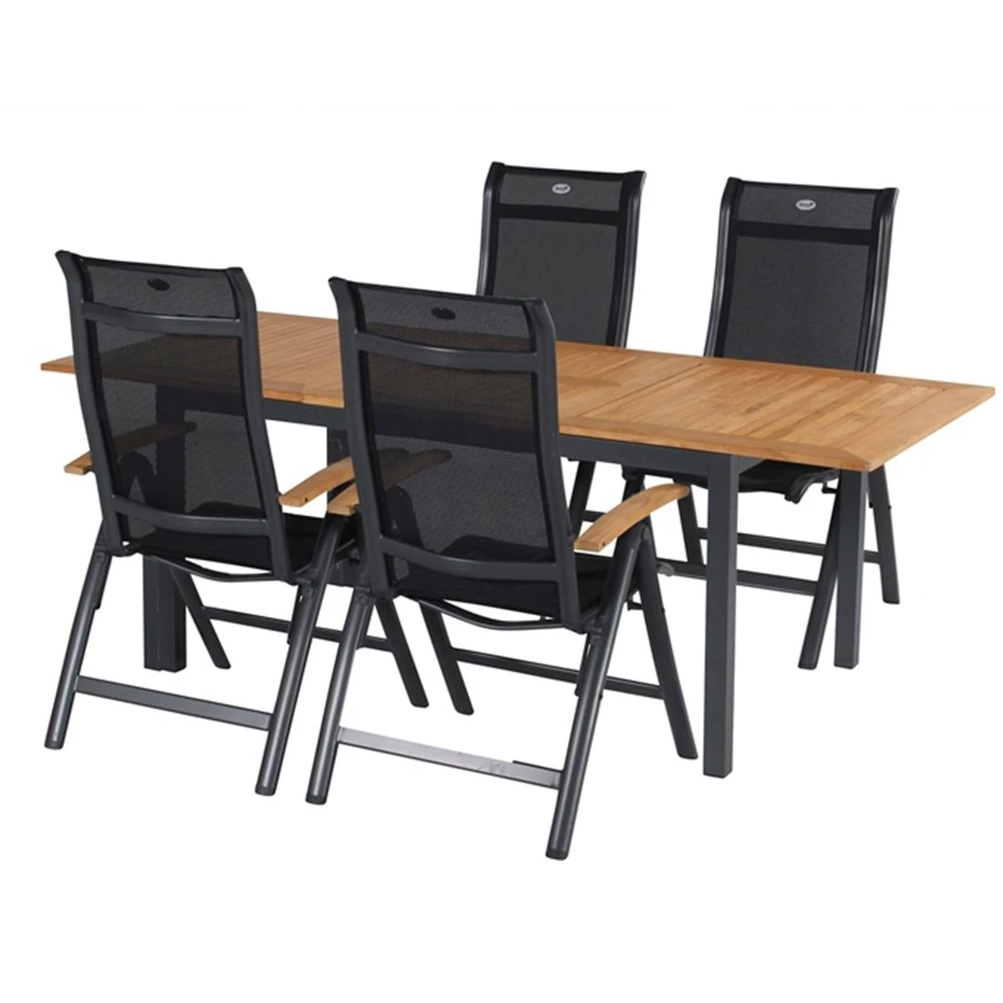 Das Gestell besteht aus pflegeleichtem und wetterfestem Aluminium. Für eine attraktive Optik ist das Gestell im Farbton Dunkelgrau gehalten. Für die Bespannung der Sitzfläche verlässt sich der Hersteller auf hochwertiges Textilene. Es zeichnet sich durch eine hohe Robustheit gegenüber Hitze und Frost aus und ist leicht zu reinigen. Damit der Klappsessel optisch ansprechend ist, sind die Sitzfläche und der Bezug im Farbton Schwarz gehalten.