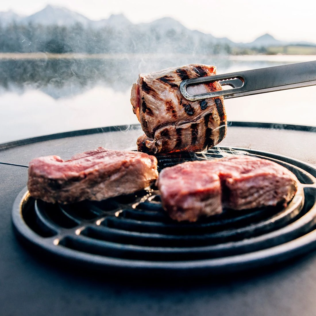 Außen knusprig, innen zart: Wer sein Fleisch gerne über offener Flamme scharf anbrät, kommt an dem höfats Bowl Grillrost nicht vorbei. Der Grillrost ist aus Gusseisen gefertigt und verleiht Ihrem Steak das appetitliche Branding, das für Grillgut vom Rost charakteristisch ist. Der Grillrost kann in der Mitte des Plancha-Rings von höfats (separat erhältlich) oder mit Hilfe der höhenverstellbaren Halterung in einer zweiten Ebene darüber montiert werden. Im Lieferumfang ist ein Hebewerkzeug enthalten, mit dem der Rost eingesetzt und entfernt werden kann.