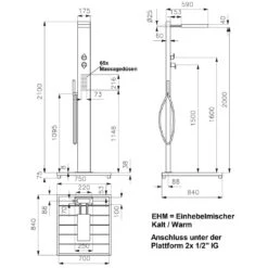 - Kalt- und Warmwasseranschluss über Flexschläuche unter der Plattform mit 2 x ½“ Innengewinde