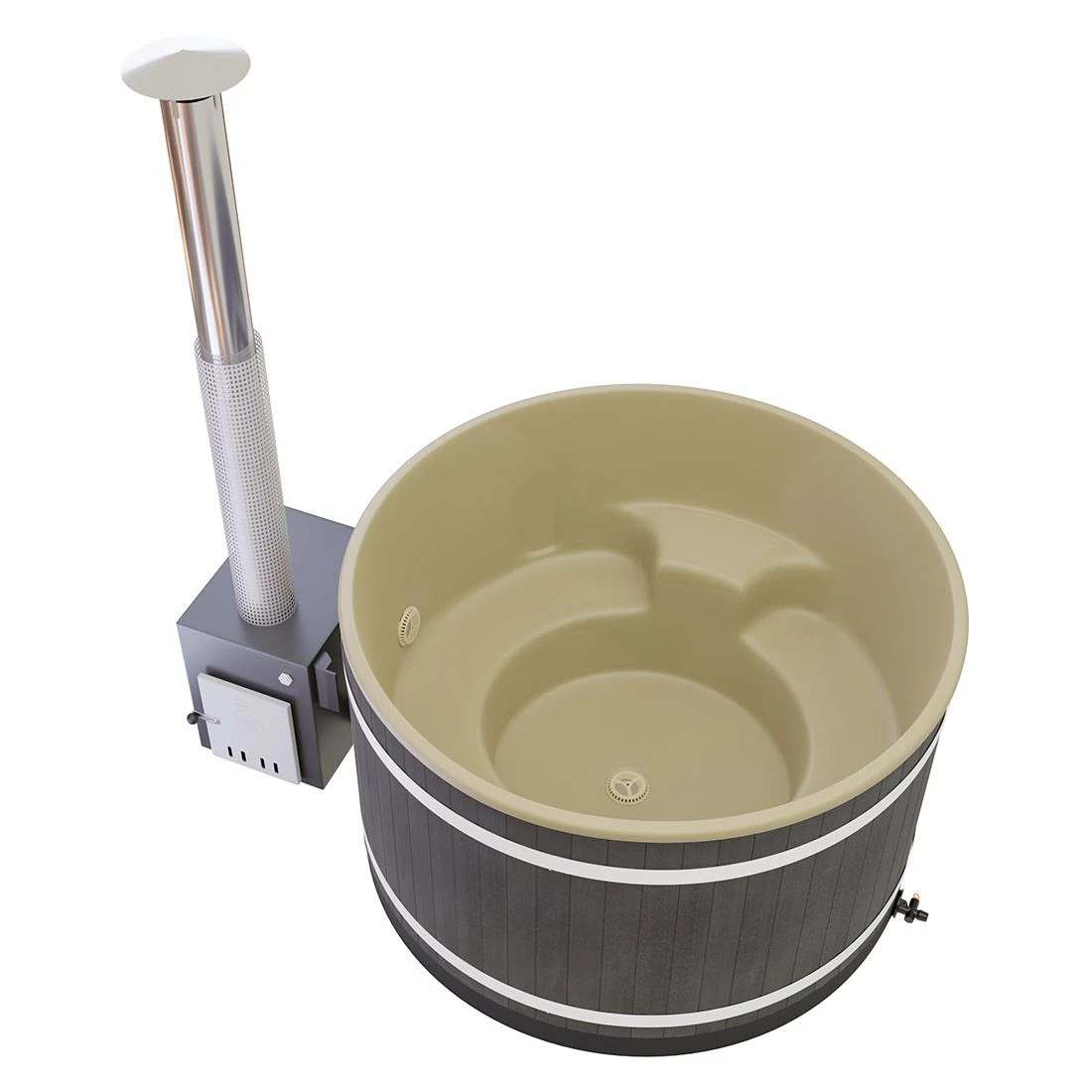 Als AuĂenofen kommt der grau gehaltene Macu zum Einsatz, der sich ideal zum Beheizen mittelgroĂer BadefĂ€sser eignet. Er wurde aus hochwertigem Meeresaluminium gefertigt, was eine Ă€uĂerst gute WĂ€rmeleitfĂ€higkeit sicherstellt. Als AuĂenverkleidung dienen zeitlose, nachtschwarze Paneele aus recyceltem Kunststoff, die sich fĂŒr ein modernes Umfeld eignen. Die glatte OberflĂ€che lĂ€sst sich leicht reinigen und erfordert abgesehen von der WĂ€sche keine Instandhaltung. Die durchscheinende, caramel-beige Innenfarbe ist eine milde und gemĂŒtliche Wahl. Die sanfte Innenfarbe ist stets stilvoll und bietet angenehmes, cremiges Baden an.