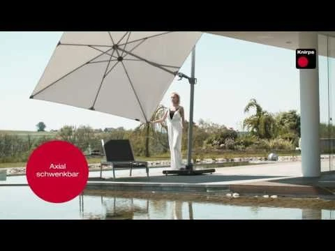 Aufgrund der durchdachten Konstruktion geht bei dem Ampelschirm nichts von der beschatteten Fläche verloren. Was Mitte der 1920er Jahre mit dem weltweit ersten kompakten Taschenregenschirm Knirps begann, ist heute zu einer innovativen Marke herangewachsen, die auch im Segment der Sonnenschirme für Qualtät und durchdachte Funktionalität steht. Der Durchmesser des Schirmstocks beträgt 50mm x 80 mm. Das quadratische Schirmdach des Sonnenschirms hat die Maße 275 cm x 275 cm. Strapazierfähiges Polyester wurde für die Bespannung des Schirmdachs gewählt. Gefertigt ist der Mast des Schirms aus Aluminium. Der Schirmmast ist in einem schlichten Grauton gehalten. Der Sonnenschirm hat eine Durchgangshöhe von ca. 205 cm. Aufspannen lässt sich der Sonnenschirm ganz einfach durch die Betätigung der Kurbel. Das Schirmdach lässt sich bei diesem Sonnenschirm aufstellen und kippen. Der Ampelschirm ist mittels Fußpedal drehbar und lässt sich somit je nach Sonnenstand bequem neu ausrichten.
