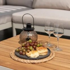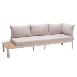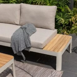 Schaffen Sie sich mit der Ecklounge Portals von LifestyleGarden den idealen Ort zum Entspannen, Feiern und GenieĂen im Freien. Der Clou: Neben dem komfortablen Sitzbereich gehört auch ein eleganter Tisch zum Lieferumfang. Er verfĂŒgt ĂŒber eine Tischplatte aus Teakholz im Farbton Natur. Dadurch fĂŒgt er sich hervorragend in das Gesamtbild ein.