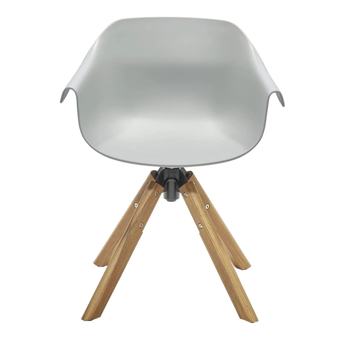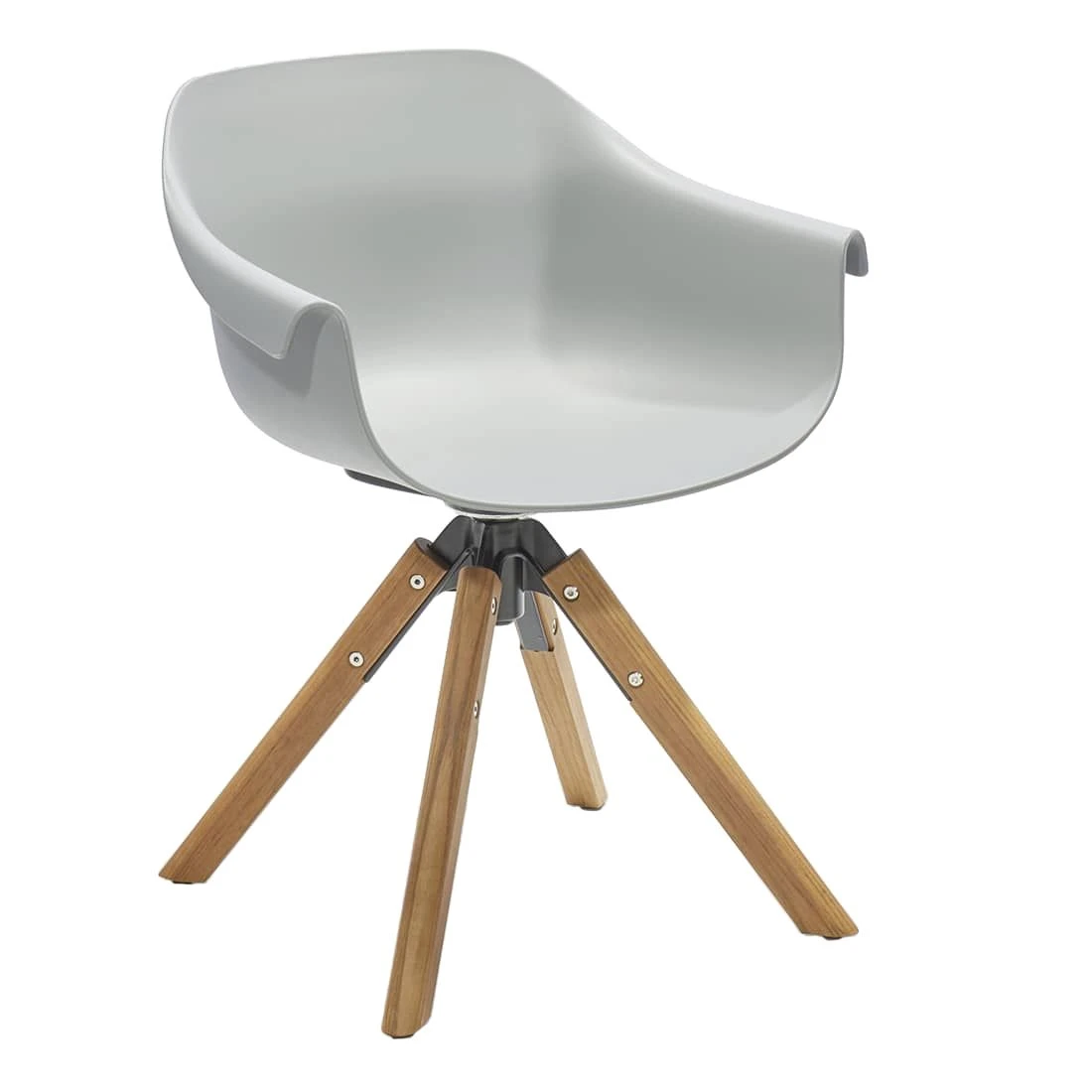 Farblich ist der Sitz in einem modernen Grau gehalten. Die organisch gebogenen Armlehnen verleihen der Formensprache des Sessels zudem eine gewisse Dynamik, die sich auch in der FunktionalitĂ€t des Sessels wiederfindet. Die auf einem StativfuĂ aus massivem Teakholz befestigte Sitzschale ist nĂ€mlich drehbar. LĂ€stiges StĂŒhledrehen gehört demnach nun auch auf der Terrasse der Vergangenheit an!