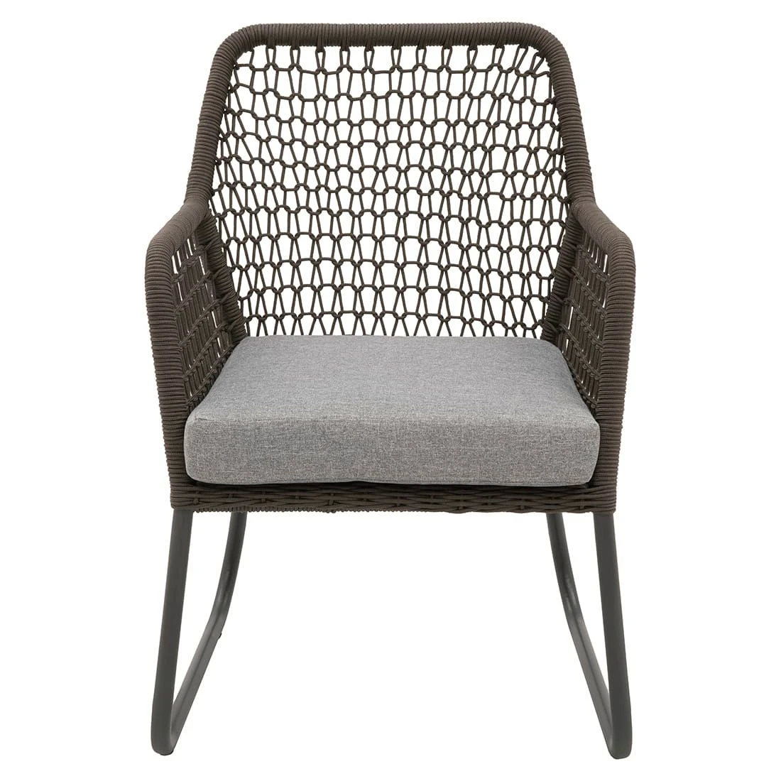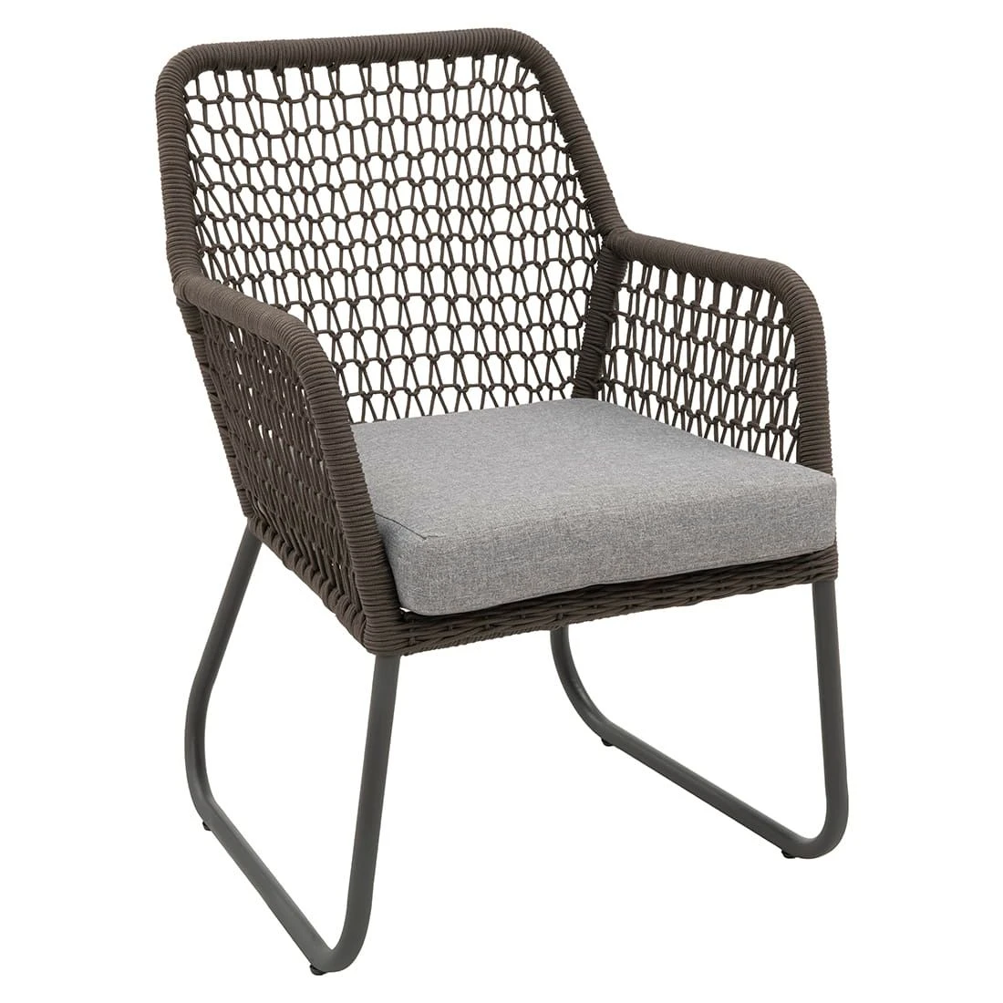 FĂŒr die Herstellung des Gestells wird hochwertiges und wetterfestes Aluminium verwendet. Das Gestell ist mit Rope umflochten und bringt somit modernen Flair auf Ihre Terrasse. Die SitzflĂ€che des Gartensessels ist mit langlebigem Stoff bespannt. FĂŒr ein perfekt stimmiges Gesamtbild sorgt die einheitliche Farbgebung in stilvollem Dunkelgrau.