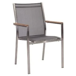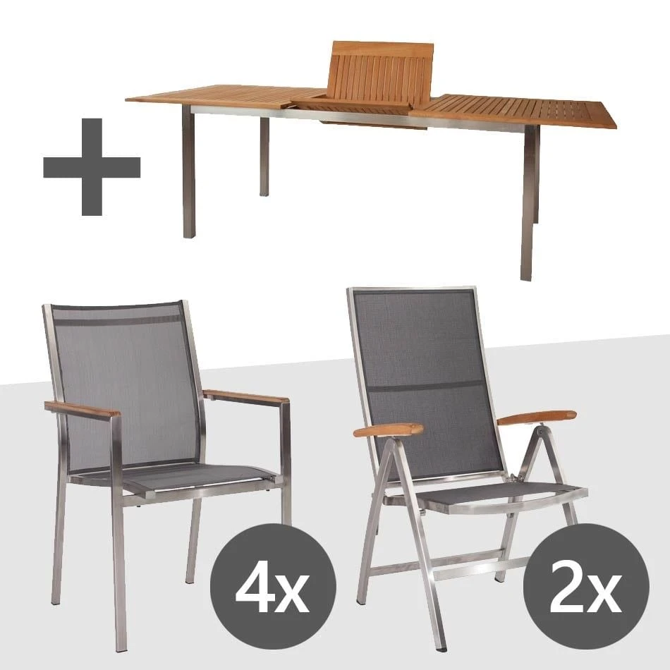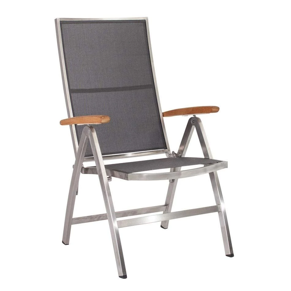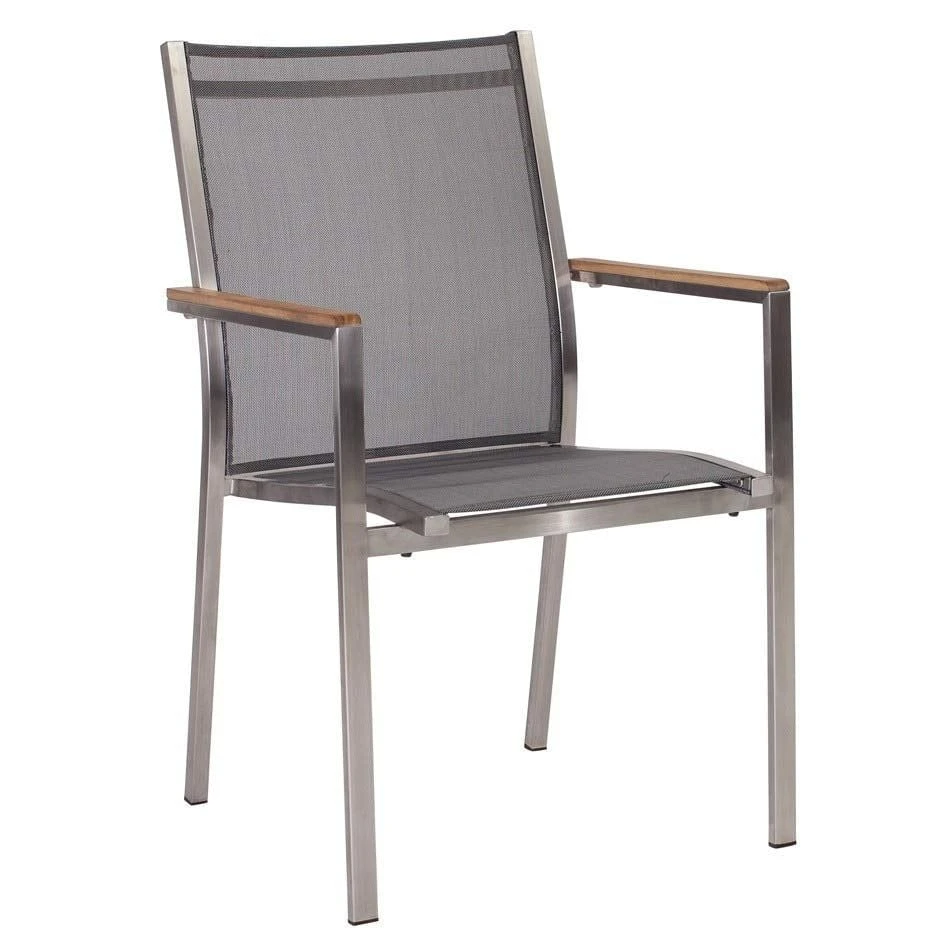Ansprechende edle Formen und Linien sind nur zwei der vielen Markenzeichen der Stapel- und Klappsessel Cardiff. Das absolut rostfreie, stoßfeste und stabile Edelstahl bildet die solide Basis der eleganten Stühle. Darauf spannt die deutsche Firma ein pflegeleichtes und wetterfestes Textilene. Hier in der Farbstellung silbergrau . i-Tüpfelchen sind die aus Teakholz gefertigten Armlehnen, klassisch und stilvoll. Selten ist Entspannung und pure Funktionalität so nah bei einander gewesen.