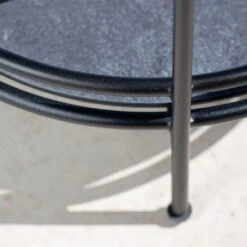 Das Gestell des attraktiven Tisches besteht aus Aluminium. Die langlebige Tischplatte besteht aus Silverstar. Dieses Material wird aus bis zu 50 Lagen Papierlaminatschichten gefertigt, die unter groĂer Hitze und hohem Druck verpresst werden. Diese Technik verleiht der Tischplatte ganz besondere Eigenschaften, denn sie ist kratzfest, kĂ€lte- (-20 °C) und hitzebestĂ€ndig (180 °C), UV-bestĂ€ndig, pflegeleicht und abriebfest. UnabhĂ€ngig von der Vielzahl an Dekoren ist der Kern immer schwarz, was man an der Kante der Platte erkennen kann. FĂŒr ein elegantes Gesamtbild erscheint die Platte in der Farbe Slate. Das Design des Beistelltischs ist klassisch rund.