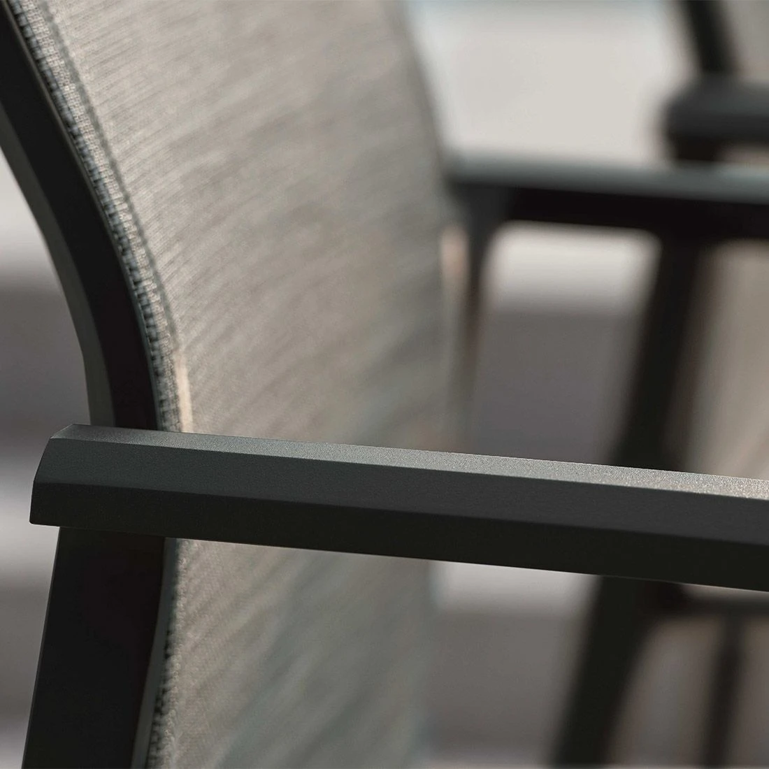 Das Gestell wird aus Aluminium gefertigt. Das geringe Eigengewicht des Materials macht den Stapelsessel zu einem robusten, aber dennoch leicht zu transportierenden Sitzmöbel auf Ihrer Terrasse. Für eine attraktive Optik ist das Gestell im Farbton Schwarz gehalten. Ein weiteres Highlight des Stapelsessels ist die Bespannung mit Textilene. Dieser Bezugsstoff überzeugt durch eine hohe Robustheit gegenüber Hitze und Frost und ist leicht zu reinigen. Die Sitzfläche hat eine attraktive Farbgebung in Leinen Grau.