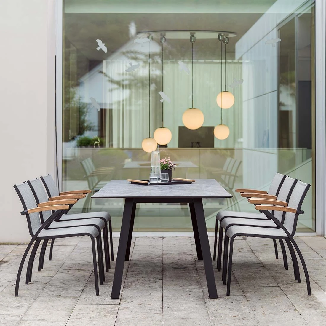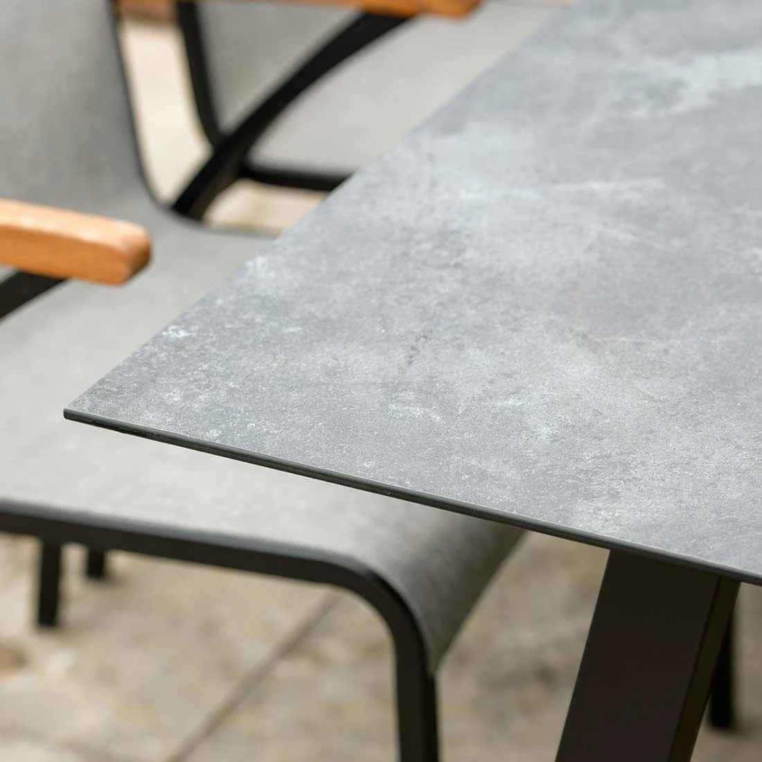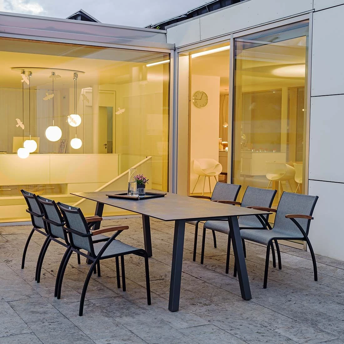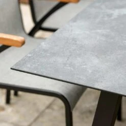 Zum Set gehört auch ein passender Tisch. Dessen Tischplatte ist aus Silverstar 2.0 in der Farbe Slate gefertigt und rundet das stimmige Gesamtbild des Gartenmöbel-Sets ab. Das klassische VierfuĂ-Gestell garantiert Ihnen maximale Beinfreiheit. Der Tisch ist klassisch rechteckig gestaltet.