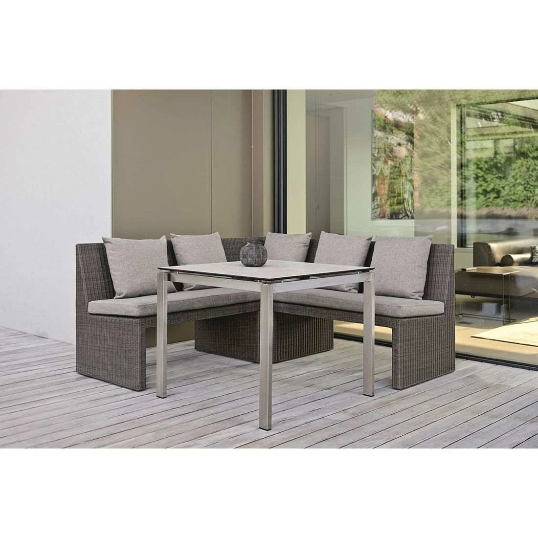 Das Gestell besteht aus Aluminium. Das Gestell, das mit hochwertigem Polyrattan umflochten ist, bringt ein exklusives Flair auf Ihre Terrasse. Dieses Material zeichnet sich durch eine hohe Wetterbeständigkeit aus. Die Sitzfläche ist angenehm gepolstert. Die Farbe des Bezugs ist Seidengrau.
