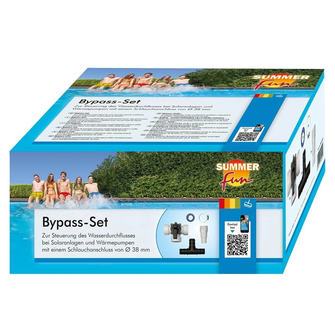 Das Summer Fun Bypass-Set ist speziell für Solarmatten und zur Steuerung des Wasserdurchflusses bei Solaranlagen, Solarmatten und Wärmepumpen entwickelt. Es hat einen Schlauchanschluss von Ø 38 mm. Mit dem Summer Fun Bypass-System kann das Wasser, welches von der Schwimmbadpumpe entweder durch den Solar-Absorber/Wärmepumpe laufen oder auch direkt ins Becken zurück fließen, wenn die Wärmezufuhr nicht erforderlich ist. Das kann nachts oder an besonders heißen Tagen gewünscht sein, wenn das Wasser nicht zusätzlich vom Solarsystem erwärmt werden soll. Genauso schnell ist das System wieder umgeschaltet und steuert den Wasserdurchfluss so, dass es erneut durch das Solarsystem fließen kann.