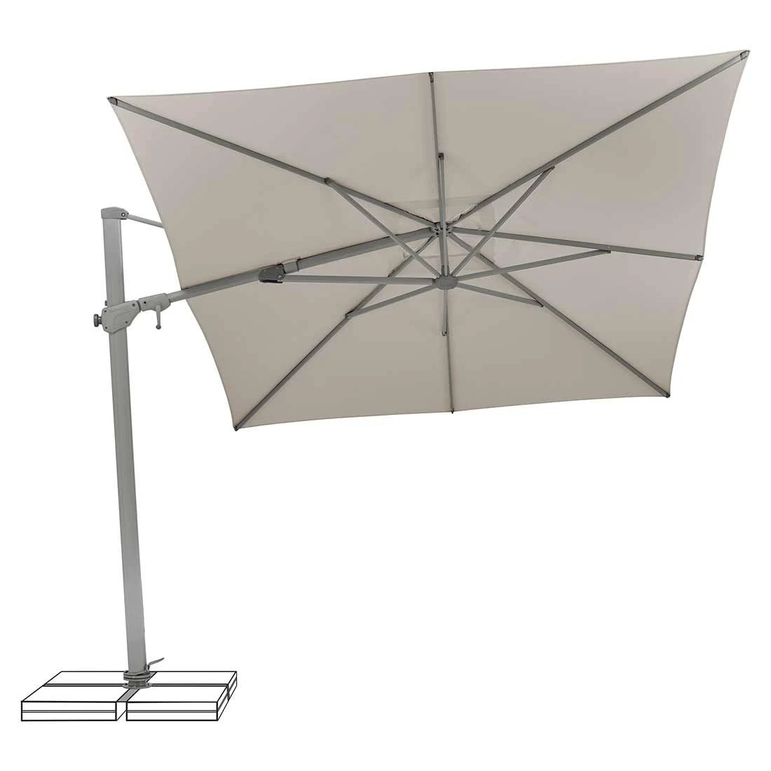 Der Mast und die Streben sind aus Aluminium in der Farbe Silber gefertigt. Die Bespannung des Schirmdaches besteht aus 100% Polyester (ca. 180 g/m2) und bietet optimalen Schutz gegen ultraviolette Strahlung (UPF 50+). Im Lieferumfang ist ein Kreuzständer für Einlegeplatten enthalten.