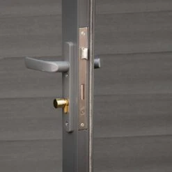 Weiterhin zeigt sich die hochwertige und optisch ansprechende Verarbeitung des Gartenhauses in der Aluminium-Doppeltür mit Milchglas, die mit einer Drückergarnitur, einem Einsteckschloss und Profilzylinder ausgestattet ist. Die Dachsparren bestehen wie die unterste Wandbohle und die Dachblende aus hochwertigem Aluminium.