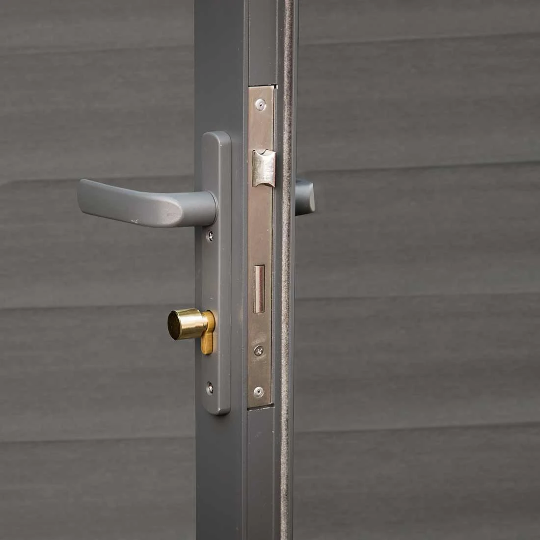 - Material: WPC (naturfaserverstärkter Kunststoff) in Grau, RAL 7015