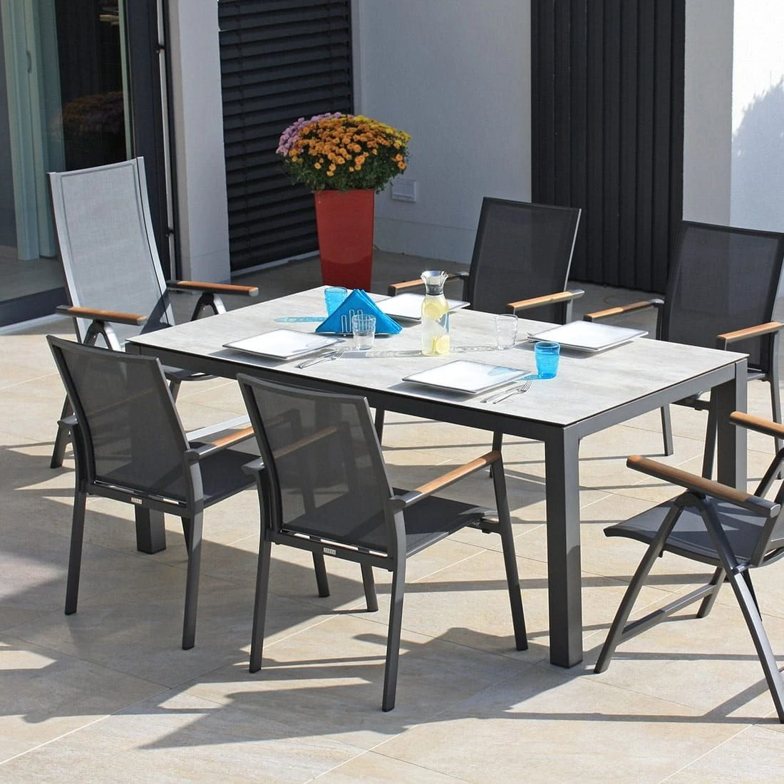Das Gestell wird aus Aluminium in der Farbe Graphit gefertigt. Das geringe Eigengewicht des Materials macht den Klappsessel zu einem robusten, aber dennoch leicht zu transportierenden Sitzmöbel auf Ihrer Terrasse.