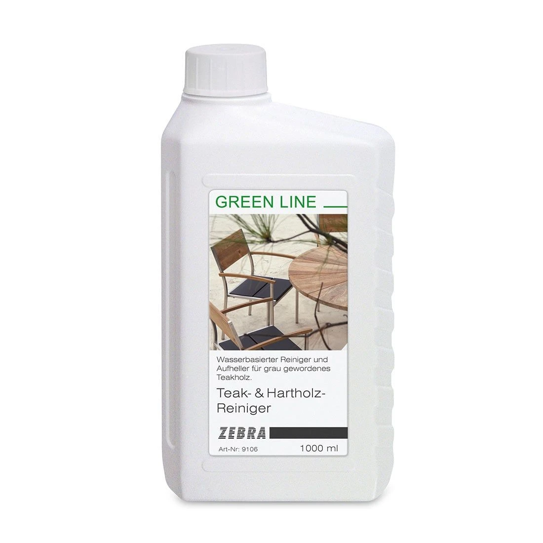 Säubern Sie Ihre Teakholz-Möbel mit diesem speziell dafür entwickelten Teak-Reiniger der Serie greenline von Zebra.